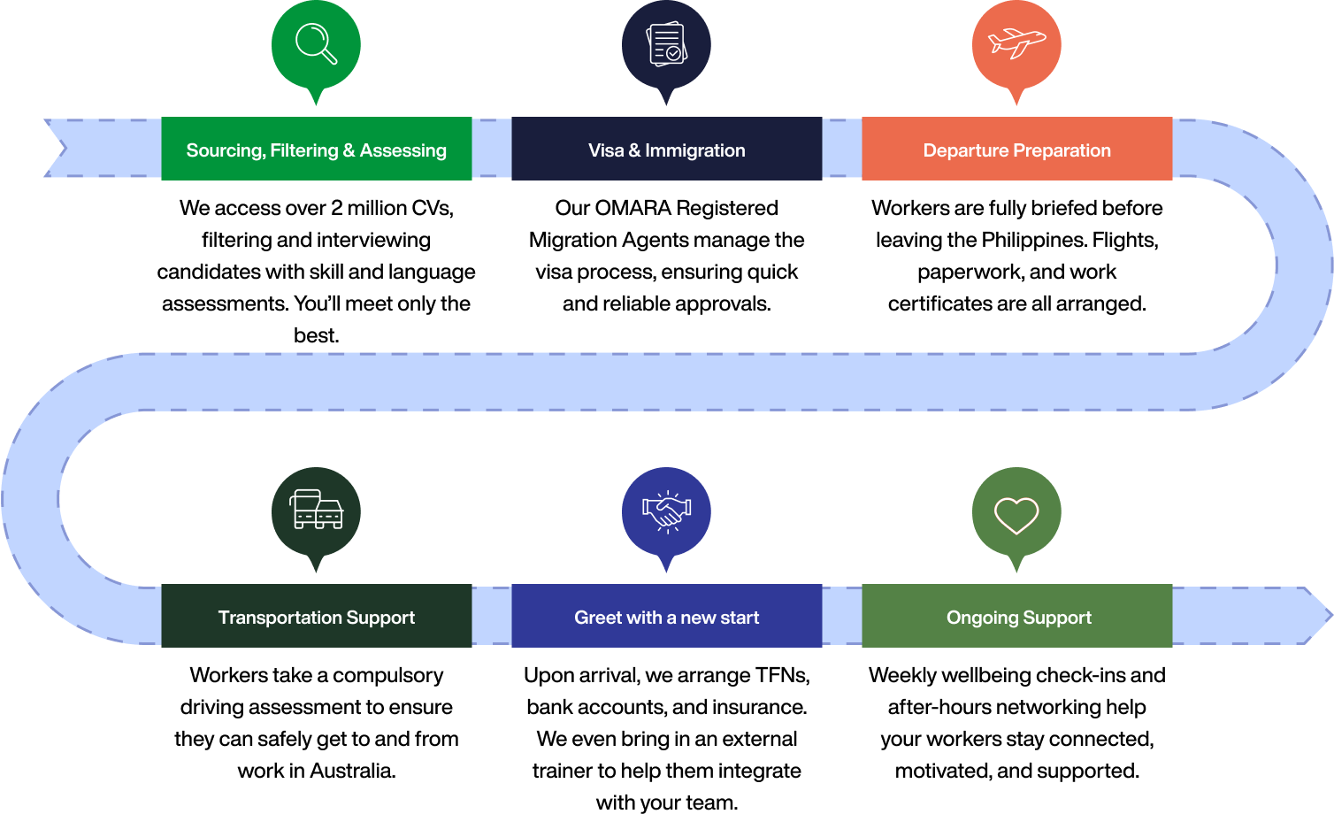 Our OMARA Registered Migration Agents work alongside our Manila-based team to manage all aspects of visa and immigration for your workers, ensuring a smooth and quick process. You can relax knowing everything is taken care of.